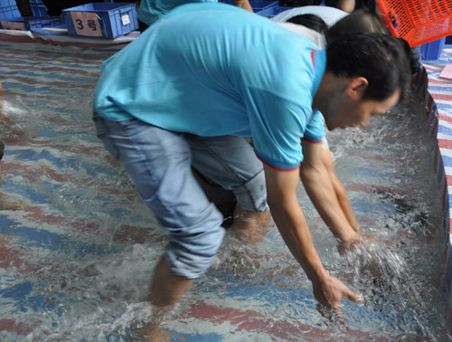 賽前的緊張氣氛,讓圍觀的人都屏住呼吸,參賽者卷起褲腳,眼神迸發(fā)出強(qiáng)烈決勝火花。隨著哨聲響起,鮮魚瞬間傾盆而入,魚群簇?fù)矶ⅲ灰娔苁謧儬幭鄵淙胨兀銧幬覔尅?ldquo;這邊有魚啊。”喊聲剛落,成群的參與者聞聲涌來,調(diào)皮的魚兒卻躲開抓捕,在腳間溜開。好不容易抓到,不料魚尾使勁一甩,又從手中滑走,更有員工在競逐間,滑倒在水池,弄得全身濕透,惹得大家哄堂大笑。看著一條條魚,被大家抓進(jìn)了盤里,滿滿的成就感,綻放在濕透的臉龐上。“今晚要來一頓豐盛的全魚宴!”員工們拎著一袋袋成果,開心說道。