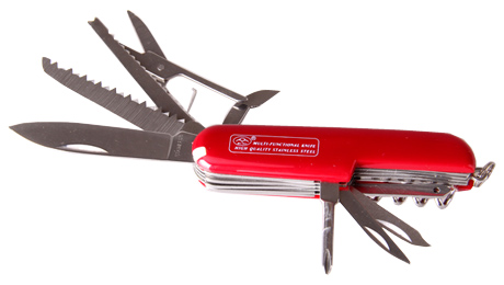 產品參數: 規格:94X25X18mm 重量:95.6g 材質:膠料+2Cr13不銹鋼+3Cr13不銹鋼 功能:1、開罐器 2、剪刀 3、大刀 4、十字螺絲刀 5、指甲銼(指甲除垢器) 6、螺旋開瓶器7、開瓶器(一字螺絲刀) 8、匙圈 等